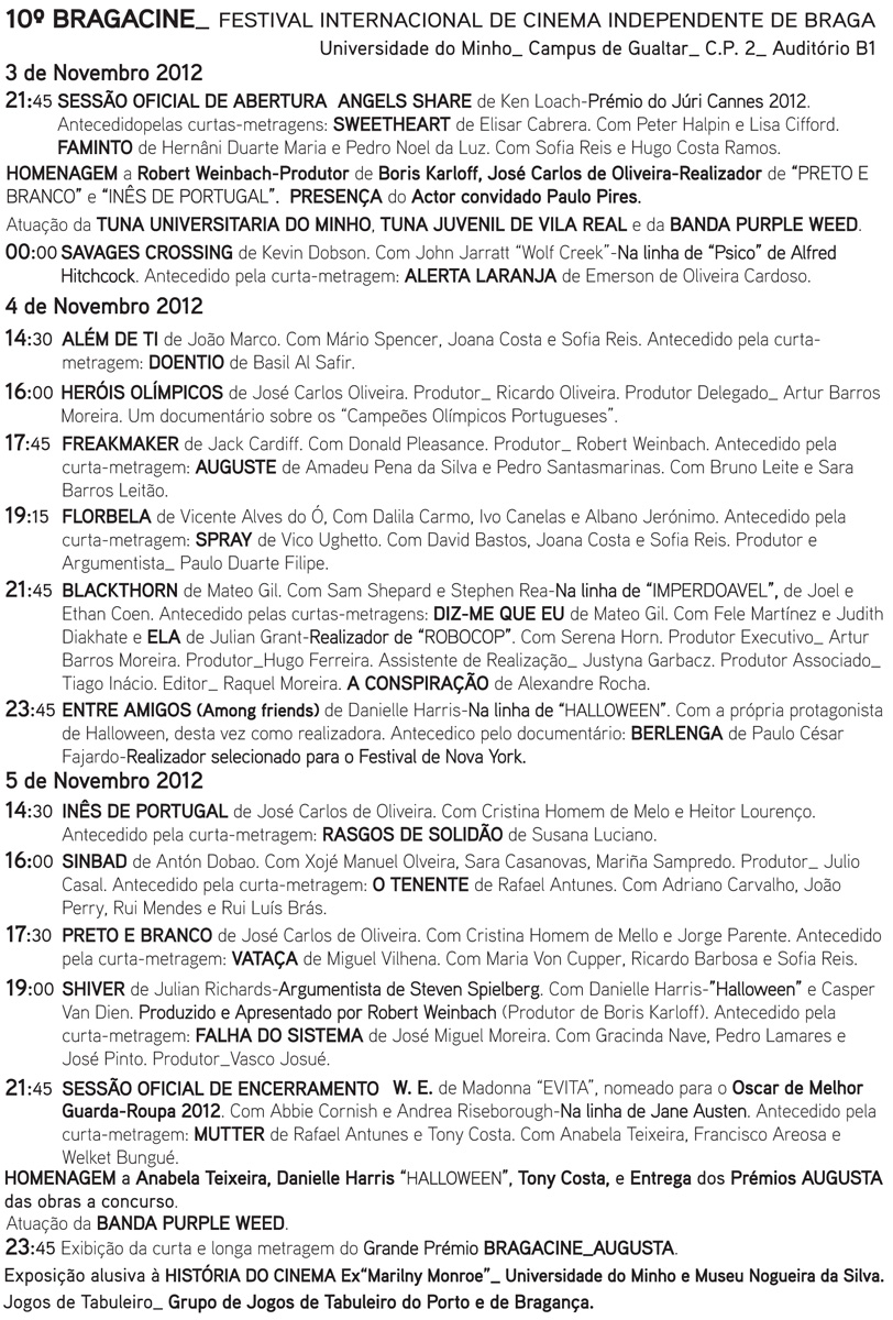 No site do Bragacine, pode ser consultada a programação (aqui) com os posters e trailers das obras presentes no festival. Destaque, para o filme português independente "Além de Ti" e entre outros do "W.E." que é o segundo filme realizado por Madonna.